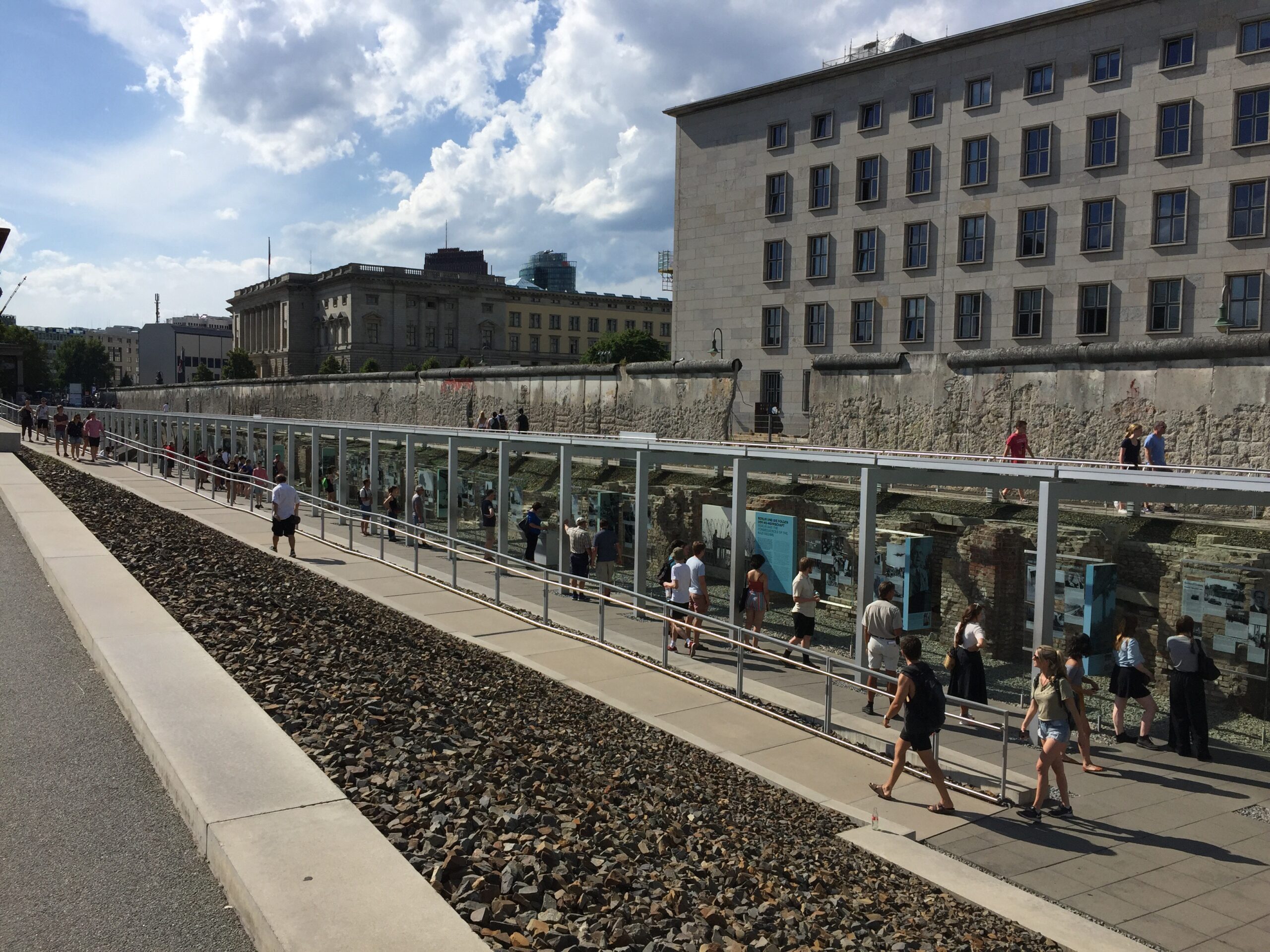 Another interesting visual at the Topography of Terror is found outside in front of the museum. On the ruins of the headquarters of the Gestapo and SS is a section of the Berlin Wall, both preserved as memorials, one on top of the other, curse upon curse.