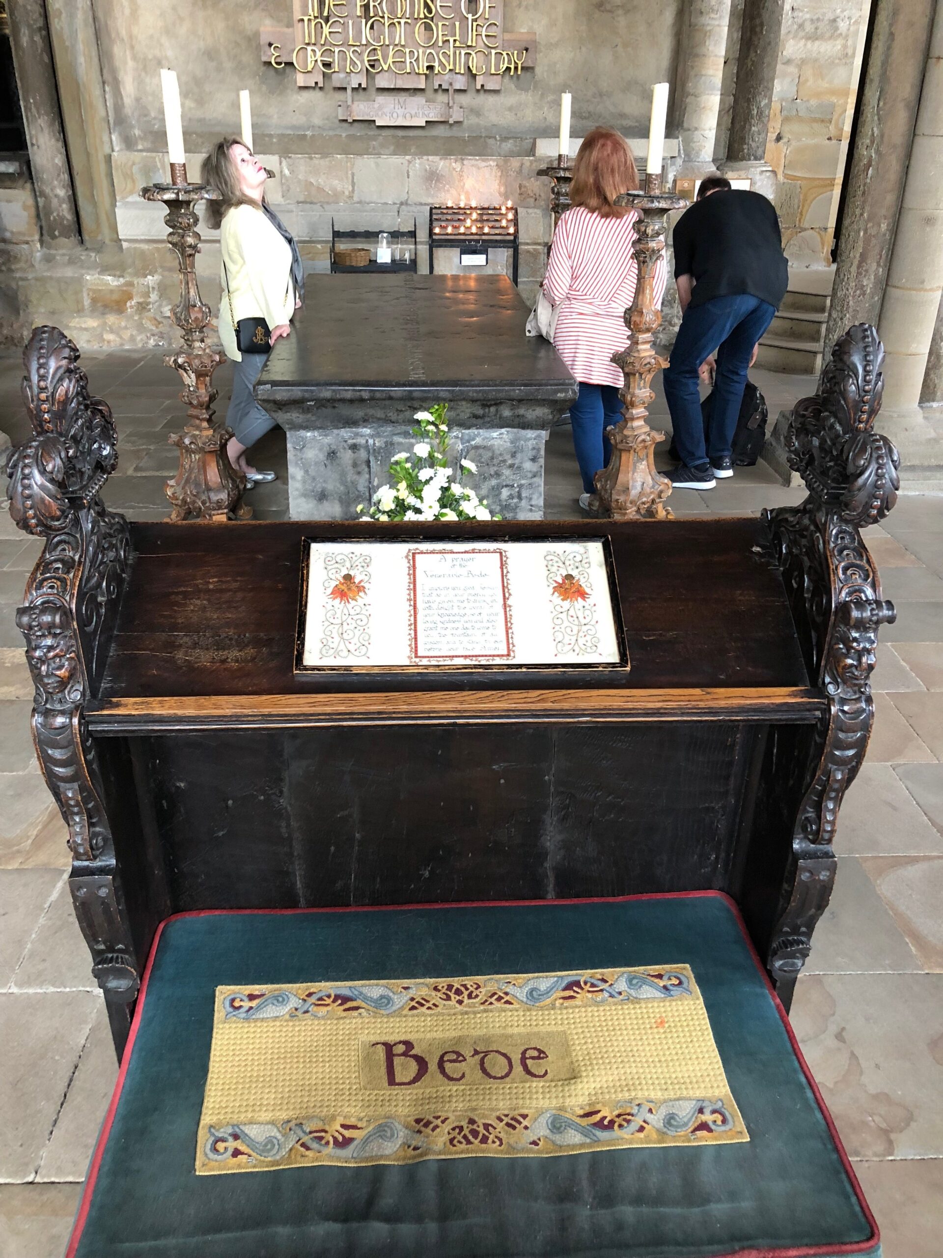 Within the cathedral we found the object of our pilgrimage, the tomb of our post-humous tour guide, the Venerable Bede. While we were talking about the tomb, one of the curators, with a badge denominating him a “Bedesman,” reminded us that this was a place of prayer and that people come from long distances to pray at the tomb of Bede.